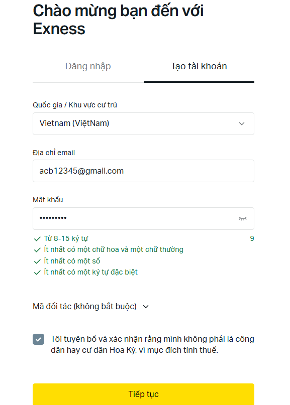 Các bạn nhập đầy đủ thông tin như hình bên dưới bao gồm: Quốc gia hiện tại, Email, mật khẩu và tích vào tôi không phải công dân Hoa Kỳ, sau đó nhấn Tiếp tục.